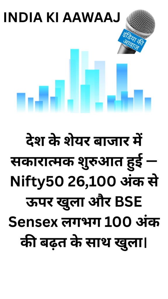 आज भारतीय शेयर बाज़ार ने सप्ताह की शुरुआत उत्साहजनक तरीके से की। शुरुआती कारोबार में ही Nifty 50 ने 26,100 अंक के ऊपर मजबूत ओपनिंग दी, जबकि BSE Sensex लगभग 100 अंकों की बढ़त के साथ खुला। यह संकेत देता है कि निवेशकों की धारणा (Market Sentiment) आज सकारात्मक बनी हुई है और खरीदारी का रुझान साफ दिखाई दे रहा है।